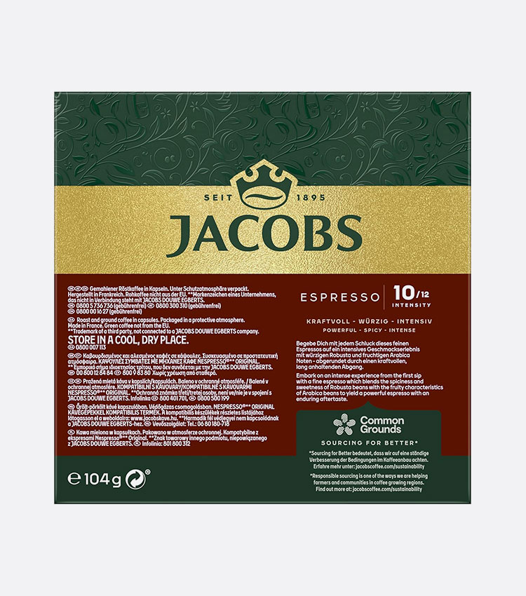 کپسول نسپرسو جاکوبز مدل اسپرسو شماره 10 (Espresso Intenso)پ، قهوهای تیره، غلیظ و خوشعطر با شدت ۱۰ از ۱۲ ارائه میدهد. این قهوه دارای رست بالا، بافتی کرمی و طعمی با تهمزهای میوهای و رایحه گلهای خوراکی داراست و برای دوستداران اسپرسوی قوی گزینهای عالی محسوب میشود. کپسولهای آلومینیومی آن با دستگاههای Nespresso Original سازگار بوده.